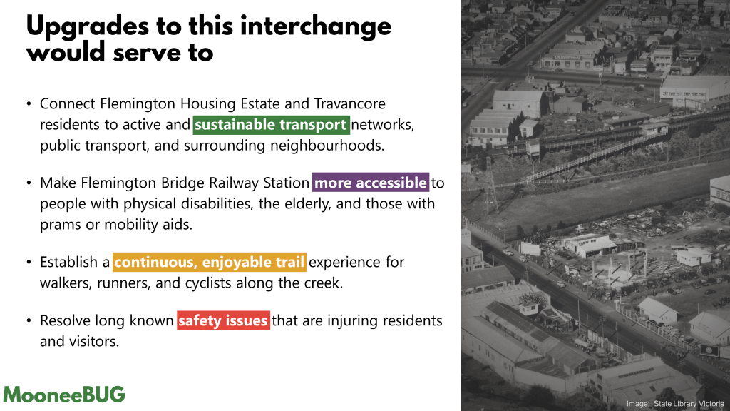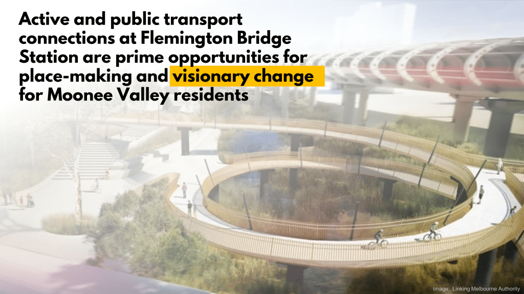 Active and public transport connections at Flemington Bridge Station are prime opportunities for place-making and visionary change for Moonee Valley residents